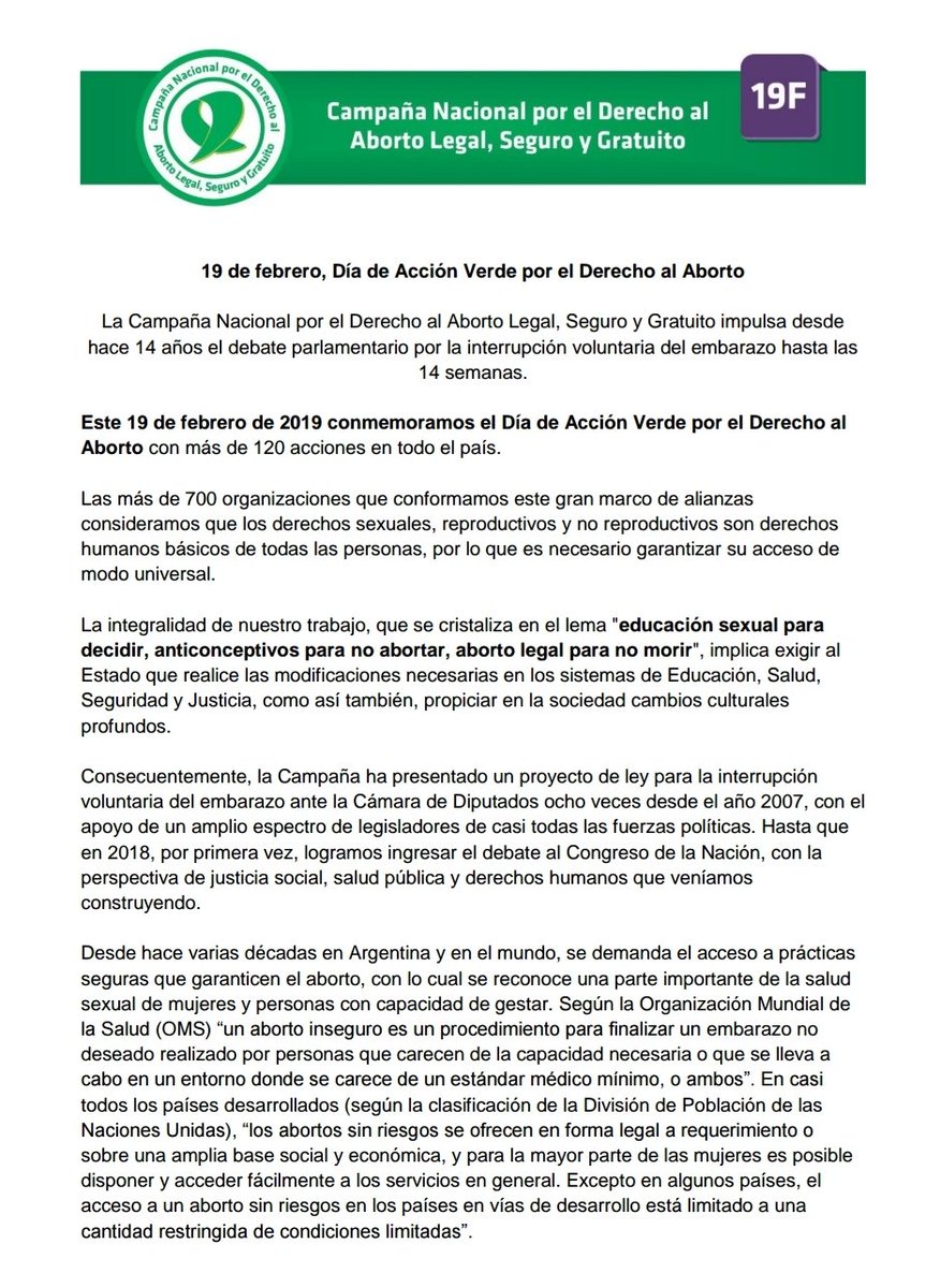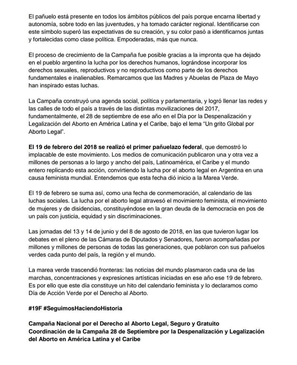 A un año del primer “pañuelazo” de 2018, el 19F se convirtió en una fecha clave para el movimiento de mujeres, bautizado Día de Acción Verde por el Derecho al Aborto, y una masiva concentración frente al Congreso, que comenzó pasadas las 17.30, fue el epicentro de una nueva manifestación por la legalización del aborto, que se replicó en ciudades de todo el país y que convocó la Campaña Nacional por el Derecho Aborto Legal, Seguro y Gratuito para mantener el tema en la agenda política y pedir que el proyecto de ley vuelva a tratarse en el recinto este año.