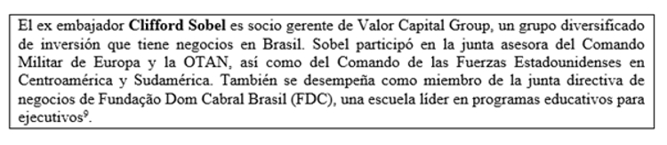 Retomando nombres concretos, se lee la disconformidad de Chevron, empresa que a pesar de estar operando como partner de Petrobras, consideraba que la estatal “abusaba” de sus privilegios en el sector. En otro cable se da cuenta de la reunión entre el entonces embajador de Estados Unidos en Brasil, Clifford Sobel (2006-2009), y CEOs de las principales transnacionales de hidrocarburos, incluidas Chevron, Exxon Mobil, Devon Energy, Anadarko, etc. dando cuenta del involucramiento del gobierno estadounidense en la “cuestión” del petróleo brasileño. En los cables sobre la situación en Brasil se puede leer: “La estrategia ahora es reclutar nuevos compañeros para trabajar en el Senado, para aprobar enmiendas esenciales a la ley…”.