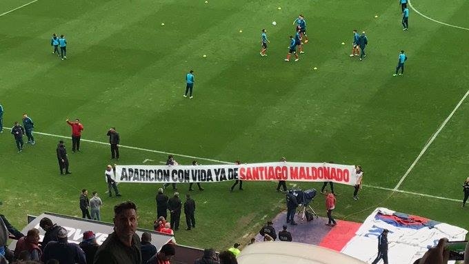 Esta vez, como ocurrió en cancha de Banfield, el mensaje surgió desde adentro del campo de juego. En el estadio de San Lorenzo, en la previa del encuentro que el Ciclón jugó contra Racing ,(y porque la AFA no autorizó al plantel lucirla en la formación), una bandera se lució por todo el borde la cancha pidiendo por Santiago Maldonado.