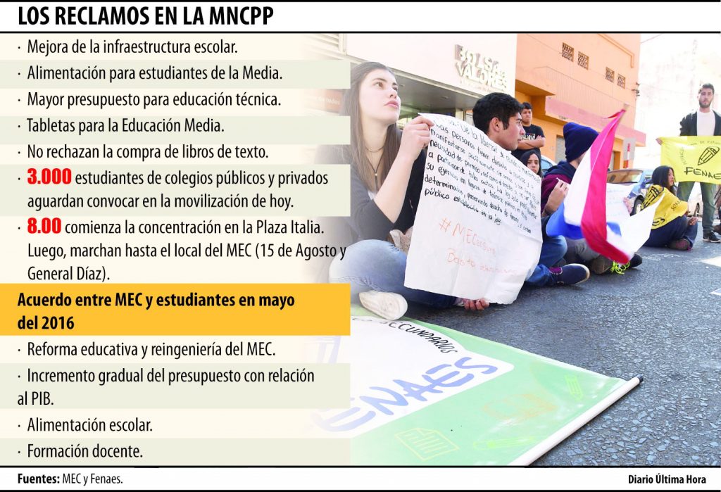 “No han cumplido con nosotros, en infraestructura las escuelas se siguen cayendo, prometieron libros todos los años y el presupuesto es el mismo que el año pasado”, aseguró Ruth Martínez, vocera de la Unión Nacional de Centros de Estudiantes (Unepy).