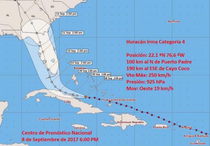 De acuerdo con el Instituto de Meteorología (Insmet), Irma tiene una presión mínima de 930 hectoPascal, avanza sobre la región central de la isla con rumbo oeste noroeste a 19 kilómetros por hora, mientras sus bandas de alimentación aun influyen sobre las provincias orientales y hasta la región occidental, con lluvias fuertes y localmente intensas.