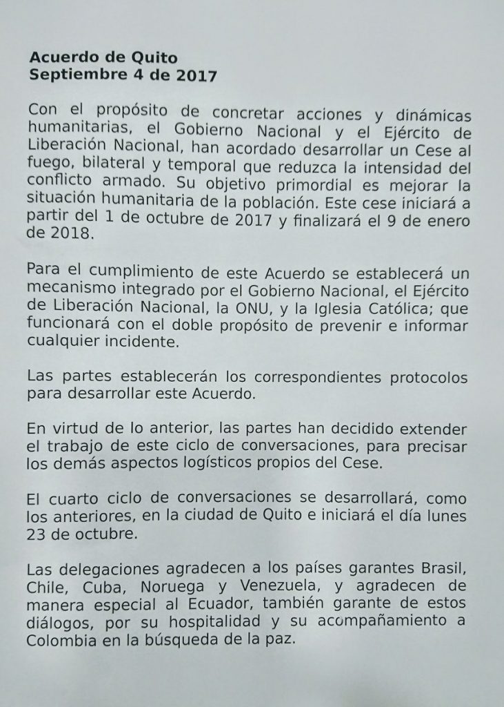 “Hoy, 4 de septiembre, exactamente 5 años después de que anunciamos el acuerdo marco con las Farc que nos condujo a la paz con esa organización guerrillera, vamos a firmar en Quito, después de intensas negociaciones que terminaron esta madrugada, un acuerdo para declarar un cese al fuego y de hostilidades bilateral con el Eln”, informó el Mandatario en una declaración a 48 horas de que llegue a Colombia el Papa Francisco y precisó que dicho cese entrará a regir el próximo 1° de octubre.