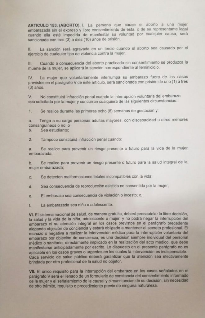 El artículo 153 contempla, en el parágrafo VI que “el sistema de salud de manera gratuita deberá precautelar la libre decisión, la salud y la vida de la niña, adolescente o mujer y no podrá negar la interrupción del embarazo ni su atención integral alegando objeción de conciencia”.