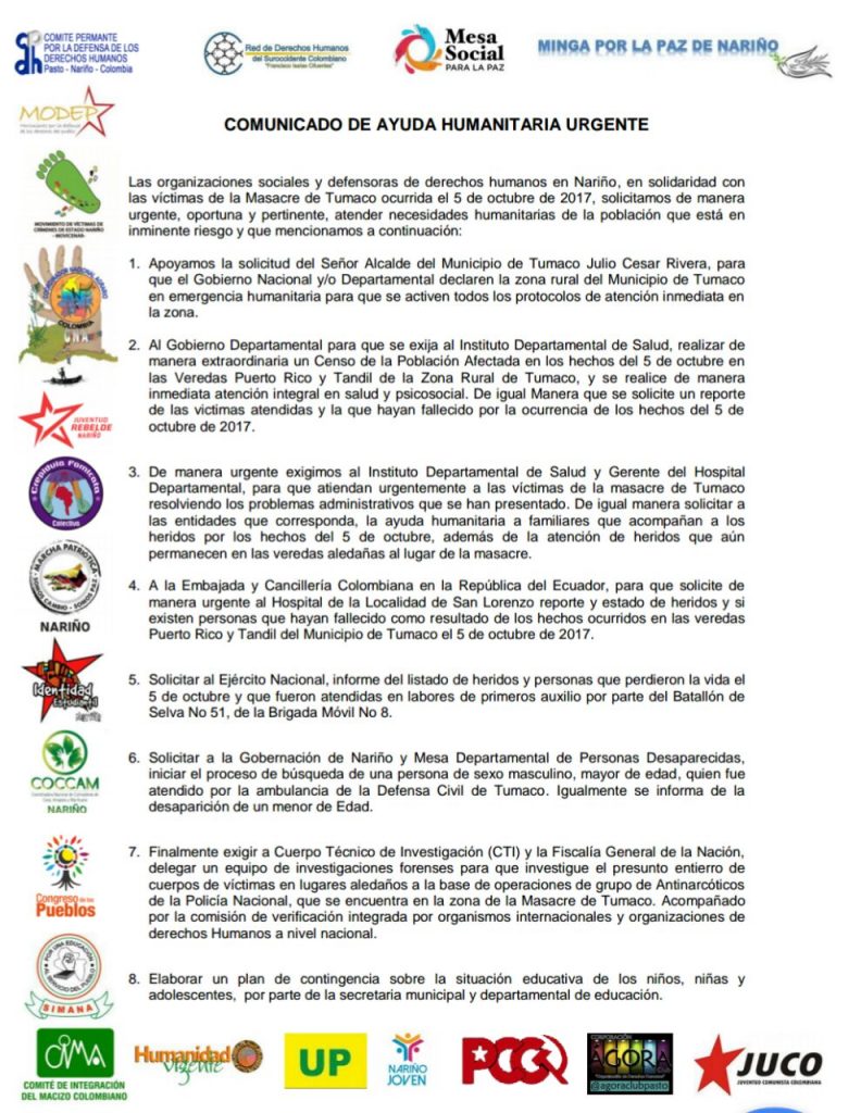 Han pasado seis días desde que se registraron enfrentamientos entre la Fuerza pública y campesinos en zona rural del municipio de Tumaco (Nariño) y aún es incierto el número exacto de víctimas mortales, desaparecidos y heridos. En un reciente comunicado emitido por organizaciones defensoras de derechos humanos y organizaciones sociales, solicitaron de manera urgente la atención a las necesidades humanitarias de la población.
