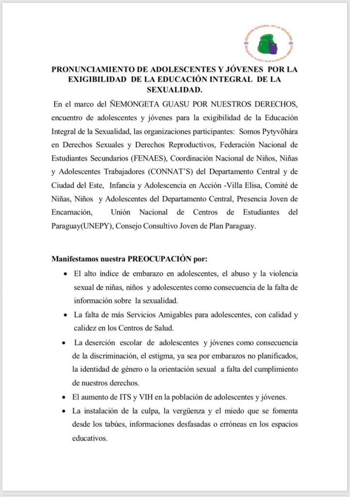 El comunicado, elaborado por ocho asociaciones juveniles, entre las que se incluyen la Unión Nacional de Centros de Estudiantes del Paraguay o la Federación Nacional de Estudiantes Secundarios, exige a las autoridades políticas públicas con enfoque de derechos, perspectiva de género y científica o la eliminación de los obstáculos para la aplicación de la educación integral de la sexualidad.