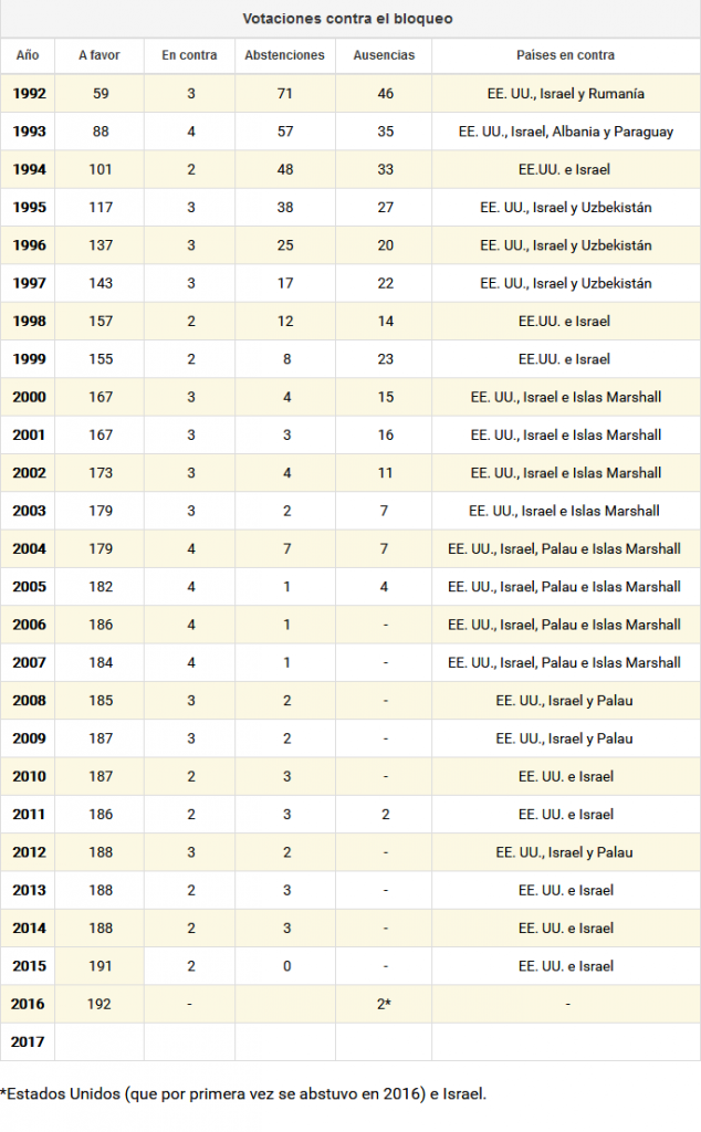 En 2016 la resolución presentada por Cuba sobre el bloqueo fue aprobada por una abrumadora mayoría de 191 votos a favor, dos abstenciones (Estados Unidos e Israel) y ninguno en contra.