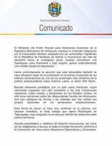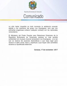 A través de un comunicado, la Cancillería de la República expresó su repudio por los acontecimientos. «Venezuela expresa su repudio e indignación por la inexcusable decisión adoptada por autoridades migratorias de Honduras de retener e incomunicar al prestigioso grupo musical venezolano, Los Guaraguao, para finalmente deportarlos bajo engaño», denunció el canciller Jorge Arreaza, a través de la red social Twitter.