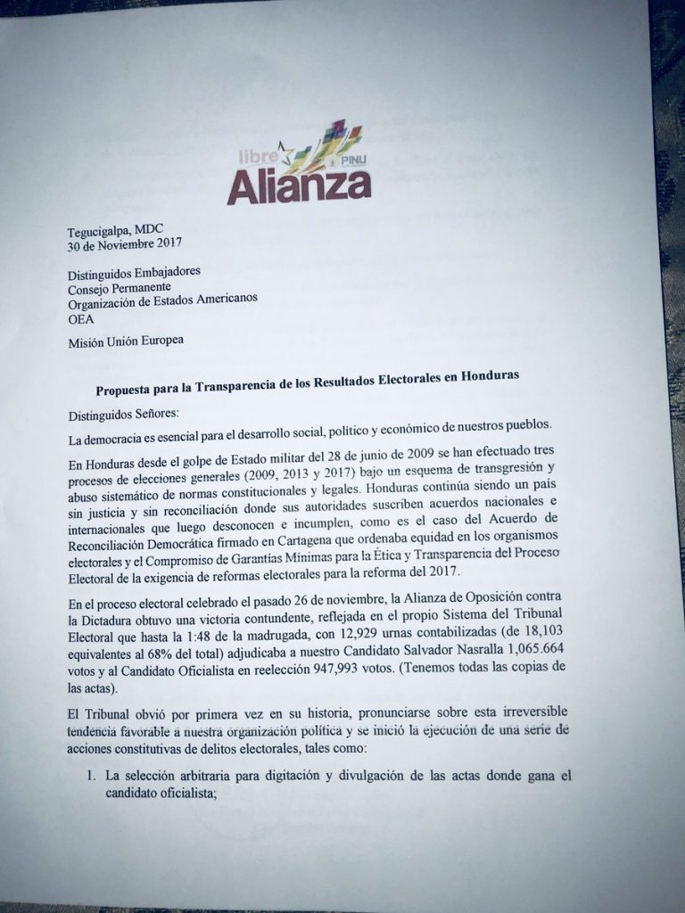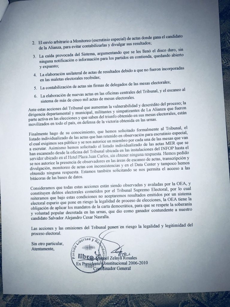 Nasralla, afirmó que ya no confía en el escrutinio del Tribunal Supremo Electoral y anunció retirara su firma del documento de compromiso para reconocer los resultados que hizo ante la misión de observadores de la Organización de Estados Americanos (OEA).