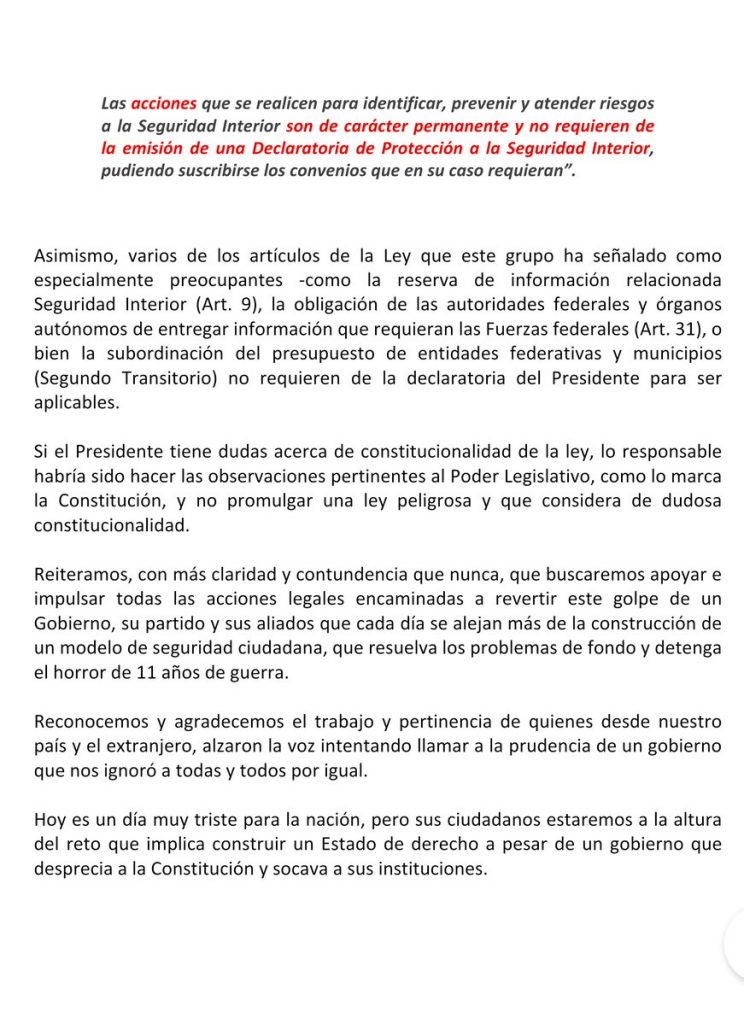 “Es lamentable que el Presidente haya decidido promulgar la Ley de Seguridad Interior a pesar de las múltiples evidencias en su contra y negándose a escuchar a organismos internacionales de derechos humanos que han advertido de las graves consecuencias de la presencia de las fuerzas armadas en las calles.