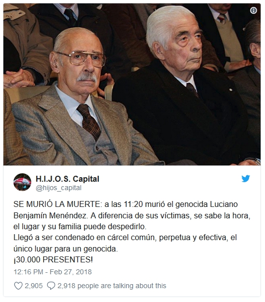 Luciano Benjamín Menéndez, la máxima autoridad en Córdoba durante la dictadura y responsable de la represión en Jujuy, Salta, Catamarca, La Rioja, San Juan, Mendoza, San Luis, Santiago del Estero y Tucumán, murió a los 90 años en un hospital cordobés donde permanecía internado desde hace unas semanas. Cumplía arresto domiciliario por las 12 condenas a prisión perpetua que recibió por sus múltiples crímenes: desapariciones, asesinatos, secuestros, torturas, violaciones y robo de bebés.