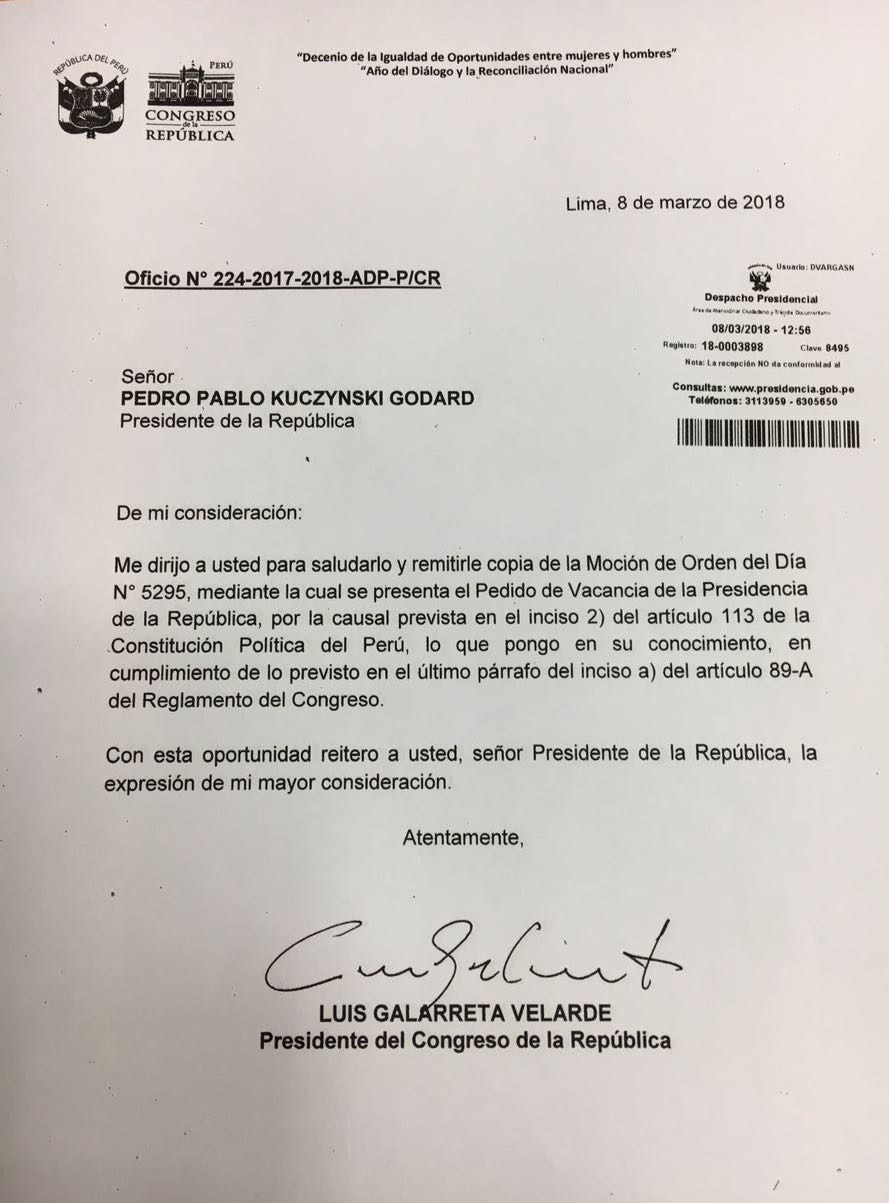 La moción de vacancia presidencial a Pedro Pablo Kuczynski por incapacidad moral fue presentada este jueves en el Legislativo luego de ser firmada por 30 congresistas.