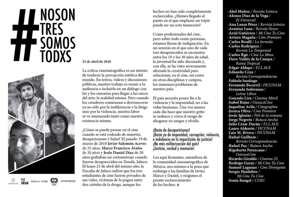 A través de un comunicado, la Comisión Nacional de derechos Humanos (CNDH) y la Comisión Estatal de Derechos Humanos de Jalisco (CEDHJ), expresaron sus condolencias y solidaridad a las familias de Jesús Daniel Díaz García, Marco Francisco García Ávalos y Javier Salomón Aceves Gastélum, los estudiantes de la Universidad de Medios Audiovisuales (CAAV) asesinados en Tonalá, Jalisco.