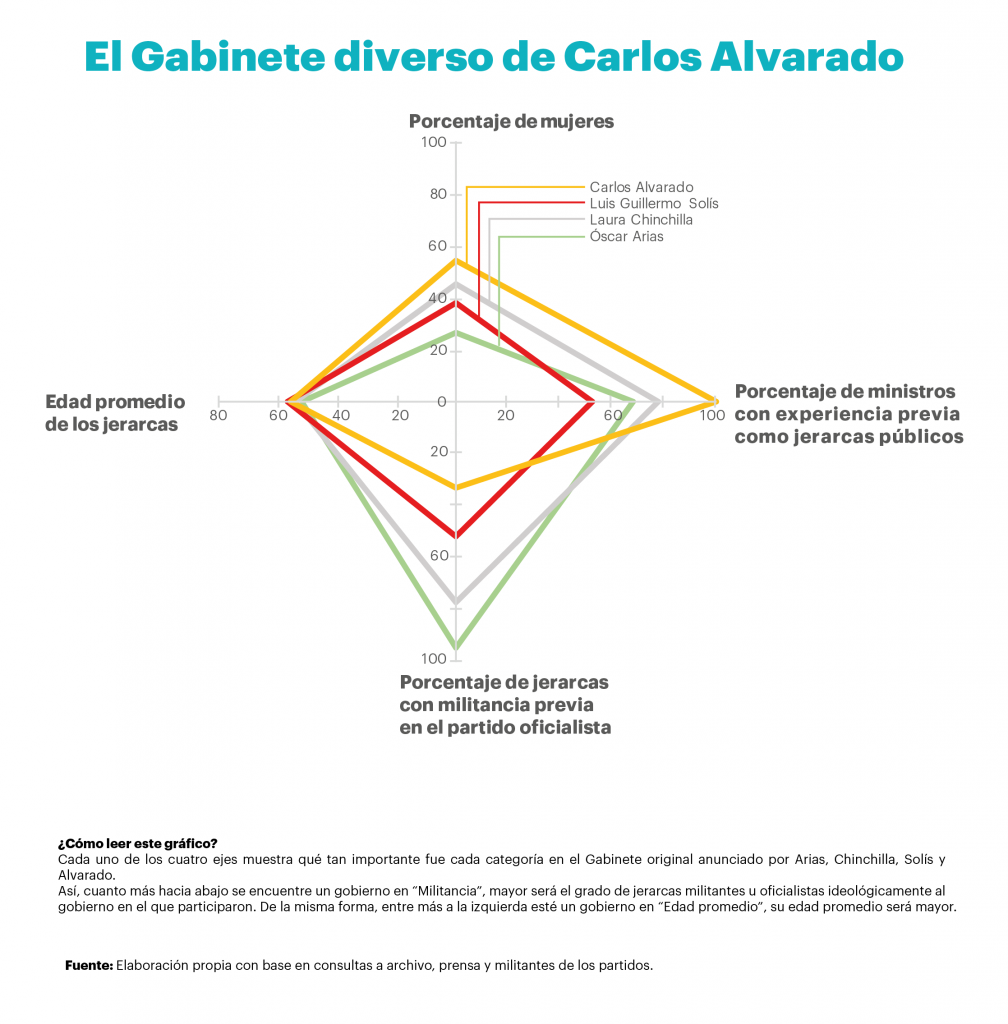 Alvarado, por su parte, es el presidente que menos ministros militantes tiene: apenas un tercio de sus jerarcas en ministerios son del Partido Acción Ciudadana, en comparación con gobiernos anteriores, donde más de la mitad de los jerarcas tenían fuerte cercanía con el oficialismo.