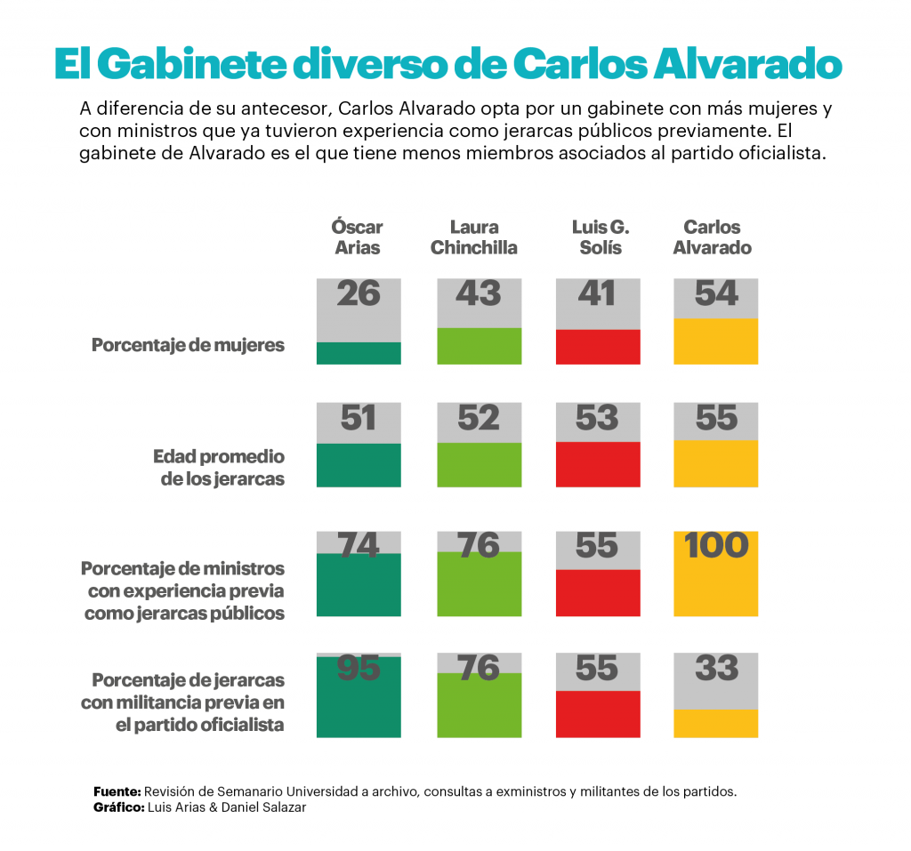 El Gabinete de Ministros que escogió el presidente electo Carlos Alvarado tiene más mujeres, más jerarcas con experiencia previa en cargos públicos y menos militantes oficialistas que los anteriores. Así se desprende de una revisión de Universidad a los gabinetes ministeriales originales desde el 2006.