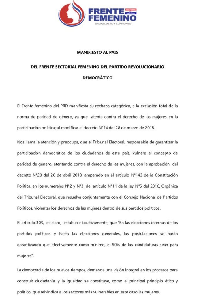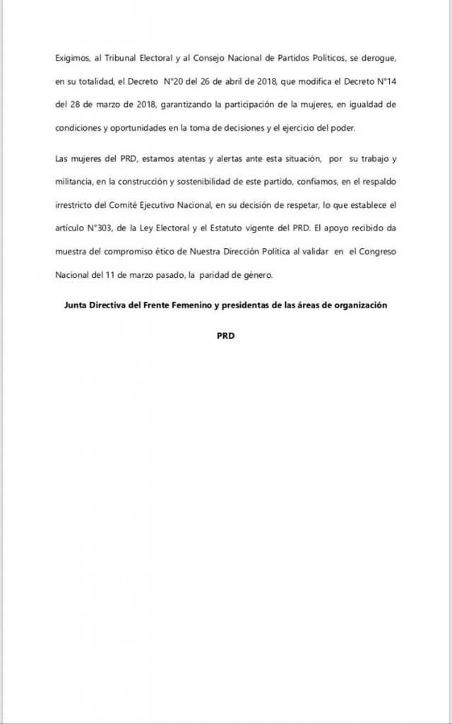 El Frente femenino del PRD manifestó su rechazo categórico a la exclusión total de la norma de paridad de género, porque atenta contra el derecho de las mujeres en la participación política.