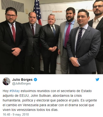 John Sullivan, subsecretario de Estado de Estados Unidos, recibió este miércoles a los dirigentes venezolanos Julio Borges, diputado a la Asamblea Nacional; David Smolansky, ex alcalde y exiliado político; Gustavo Marcano, ex alcalde y exiliado político y Carlos Vecchio, dirigente del partido Voluntad Popular y exiliado político.