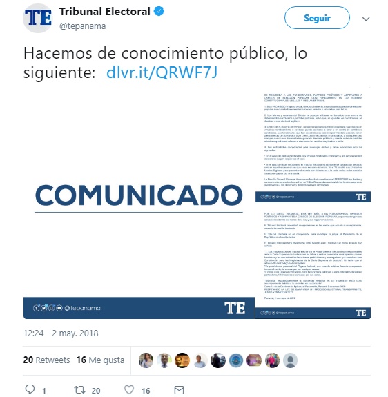 Luego de tres días de que el presidente de la República, Juan Carlos Varela, desafiara la veda electoral en un acto oficial en Cutevilla, población de La Pintada, provincia de Coclé, el Tribunal Electoral se pronunció este martes, 1 de mayo.