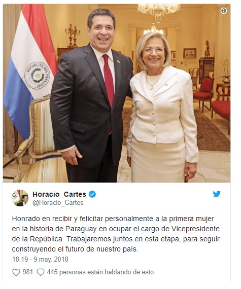 El mandatario utilizó sus cuentas oficiales en redes sociales para expresar su alegría. Fue el mismo Horacio Cartes quien impulsó la designación de la ex ministra de la Corte Suprema de Justicia como vicepresidenta.
