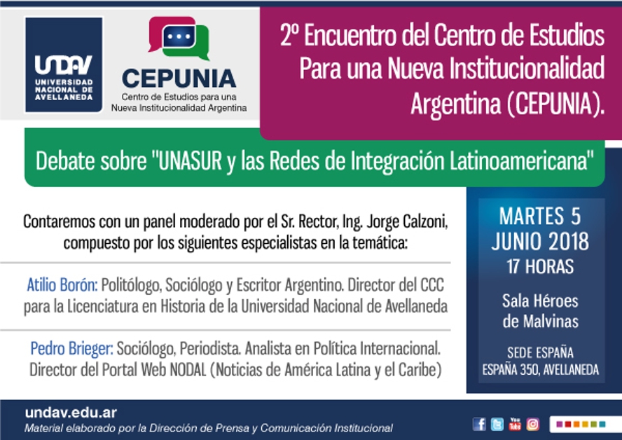 La Unión de Naciones Suramericanas (UNASUR) y las redes de integración latinoamericanas serán los tópicos que el próximo martes 5 de junio animarán el debate del segundo encuentro del Centro de Estudios para una Nueva Institucionalidad Argentina en la Universidad Nacional de Avellaneda (UNDAV).
