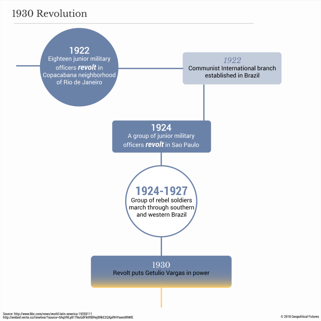 Los jóvenes oficiales militares de Brasil también estuvieron expuestos a las ideologías europeas, ya que gran parte de su educación militar se basó en modelos europeos. Los oficiales más jóvenes simpatizaron con movimientos sociales más amplios y críticos con el gobierno oligárquico, en parte porque los militares se mantuvieron al margen del poder durante la Primera República. Esto culminó en una serie de pequeñas rebeliones a lo largo de la década de 1920 llevadas a cabo por tenientes y capitanes en Río de Janeiro, Sao Paulo y Rio Grande do Sul. Las rebeliones nunca lograron derrocar al gobierno, pero fueron precursores importantes de los eventos futuros.