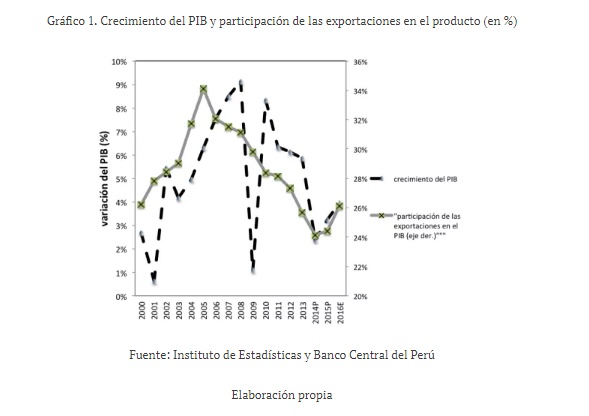 En el período 2000-2016 la senda de crecimiento del Producto Interno Bruto (PIB) peruano dibuja la forma de U invertida (ver gráfico 1), donde se observa una importante aceleración del crecimiento en el período 2000-2008 y una desaceleración en el período 2010-2016, pero siempre con tasas positivas y notables.[1]