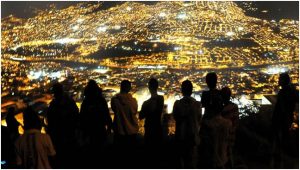 “Todos vivimos bajo el mismo cielo, pero ninguno tiene el mismo horizonte”, dijo el político alemán Konrad Adenauer. Colombia tiene atracciones turísticas dignas de destacar y una de ellas es la ciudad de Medellín. En el pueblito de Paisa una persona puede tomarse un guarapo (jugo de caña de azúcar y limón) mientras ve el atardecer. El parque Arví también constituye un lugar importante por ser una reserva ecológica así como el Parque de los Deseos donde se ubica el jardín botánico. Pero al montarnos en un metrocable y subir cuesta arriba se puede observar otra perspectiva del paisaje.