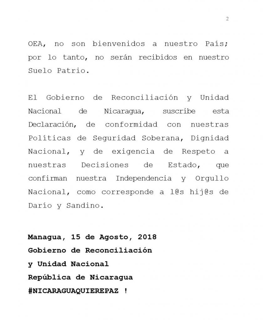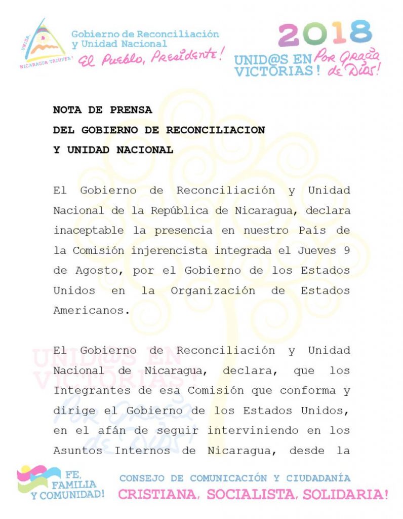‘Los integrantes de esa comisión que conforma y dirige el gobierno de los Estados Unidos, en el afán de seguir interviniendo en los asuntos internos de Nicaragua desde la OEA, no son bienvenidos a nuestro país; por lo tanto, no serán recibidos en nuestro suelo patrio’, expresó.