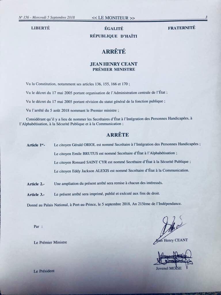 Le citoyen Ronsard St-Cyr est nommé Secrétaire d’État à la Sécurité Publique ;