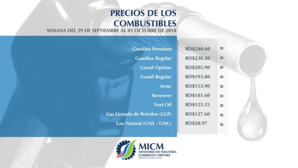 El Ministerio de Industria, Comercio y Mipymes (MICM), dispuso para la semana del 29 de septiembre al 5 de octubre de este año, mantener sin variación los precios de los combustibles.
