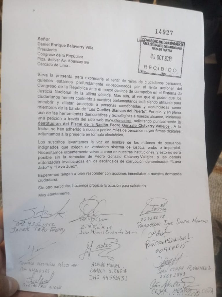 Exigen destitución de Pedro Chávarry. Miles de ciudadanos, representados por César Medina, presentaron un oficio dirigido al presidente del Congreso, Daniel Salaverry, precisando que se recolectaron las 50 mil firmas para solicitar la salida del fiscal de la Nación.