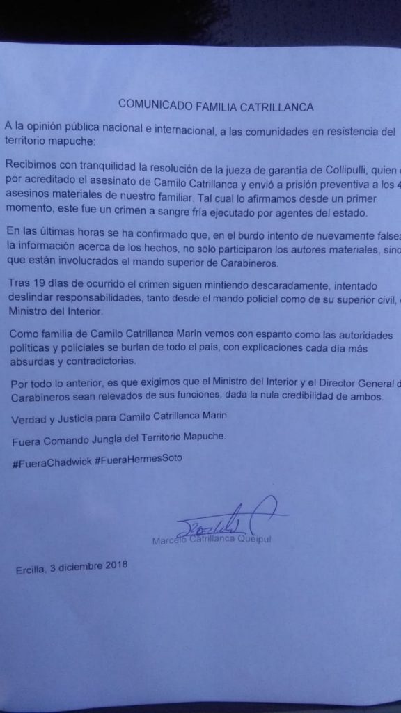 En un comunicado de prensa, el padre de la víctima, Marcelo Catrillanca Queipul, indicó que recibieron con tranquilidad la resolución de la jueza de garantía de Collipulli, quien dio por acreditado el asesinato de Camilo y envió a prisión preventiva a los 4 carabineros acusados.