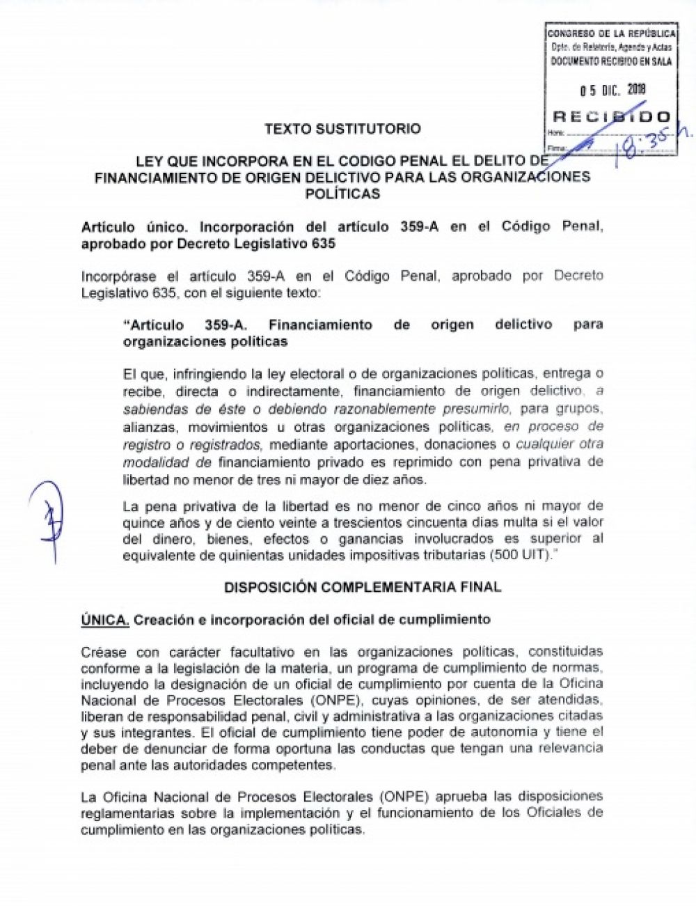 El artículo incorporado señala que «el que infringiendo la ley electoral o de organizaciones políticas, entrega o recibe, directa o indirectamente, financiamiento de origen delictivo […] es reprimido con pena privativa de libertad no menor de tres ni mayor de diez años».