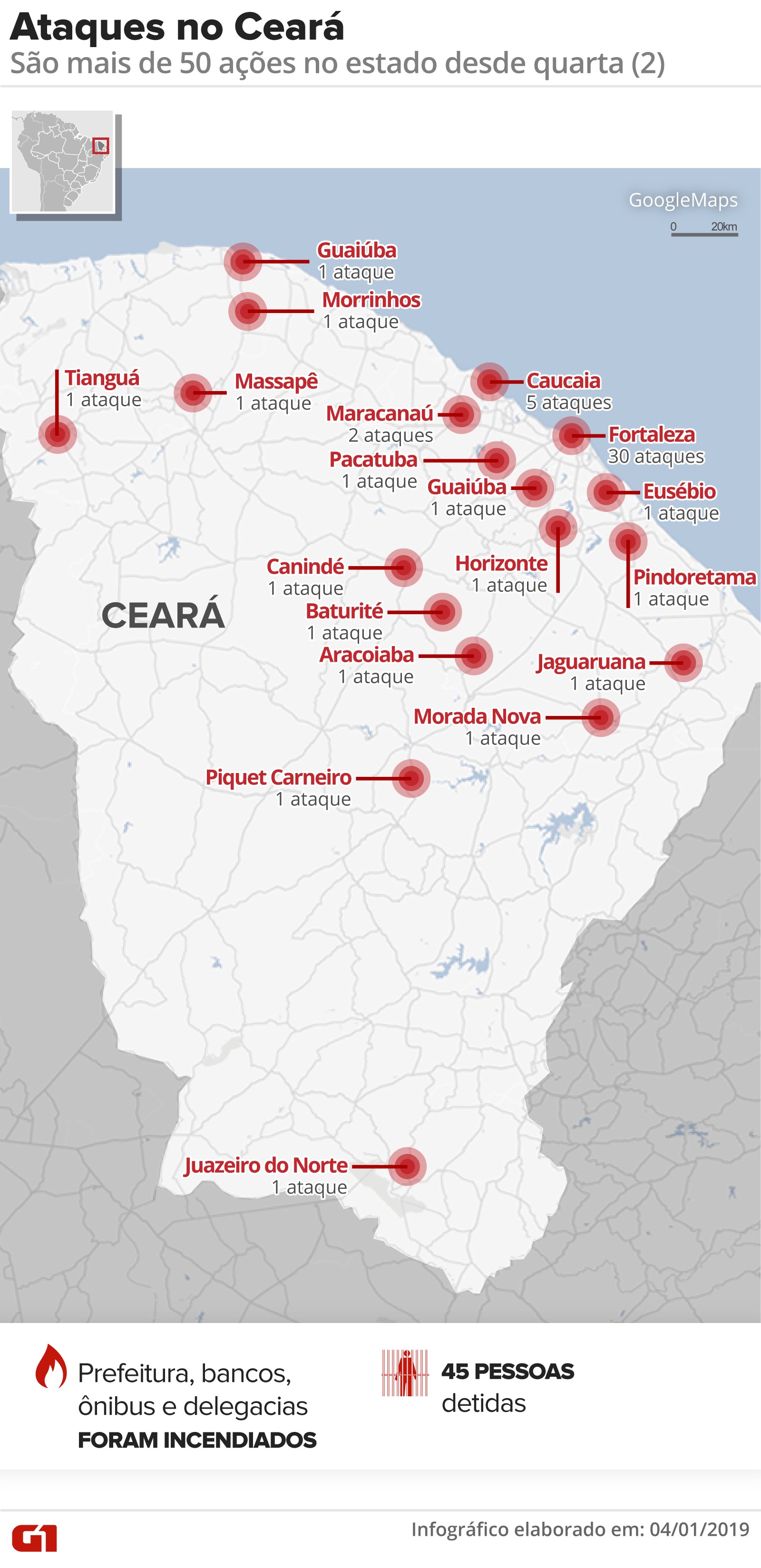A partir da noite de quarta-feira (2), ocorreram mais de 40 ataques em Fortaleza, Tinguá, Pacatuba, Horizonte, Maracanaú, Caucaia, Pindoretama, Eusébio, Morada Nova, Jaguaruana, Canindé, Piquet Carneiro, Morrinhos, Aracoiaba e Baturité.