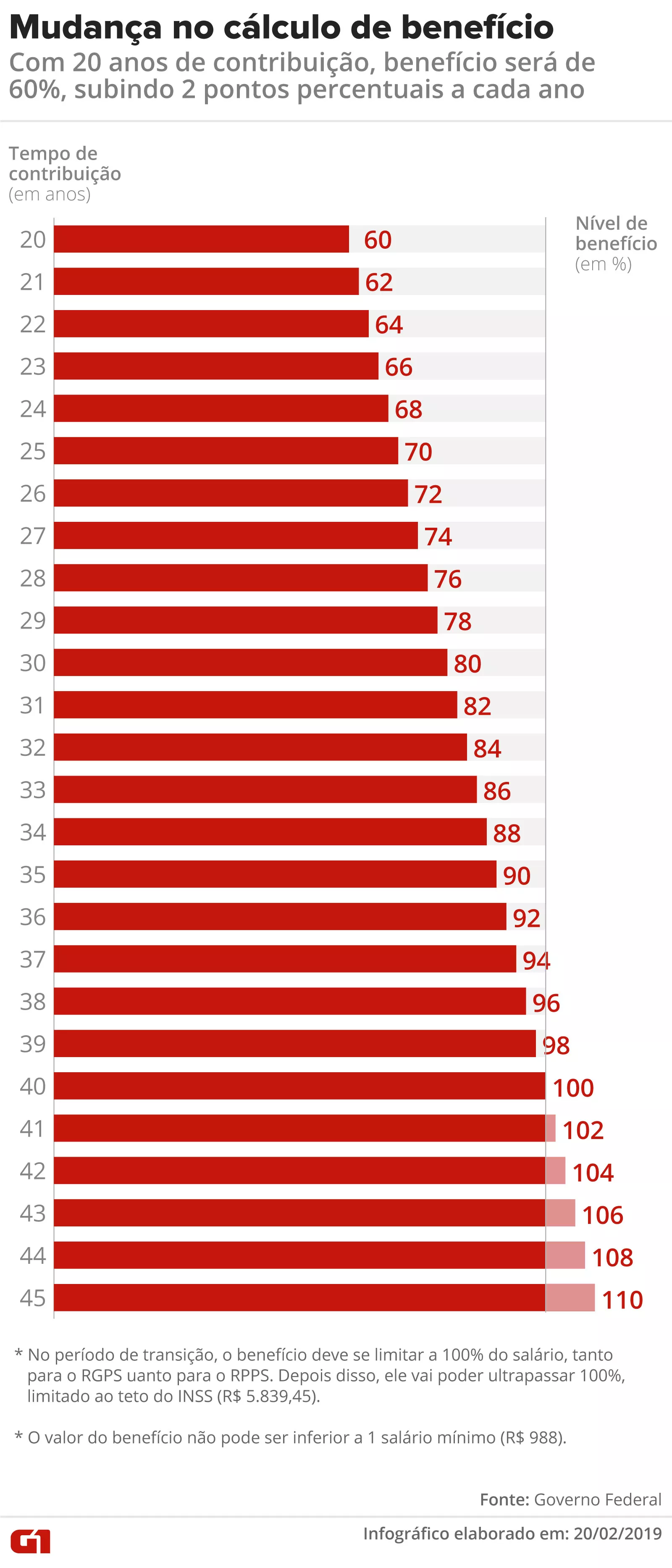 Com 20 anos de contribuição (o mínimo para os trabalhadores privados do regime geral), o benefício será de 60%, subindo 2 pontos percentuais para cada ano a mais de contribuição.