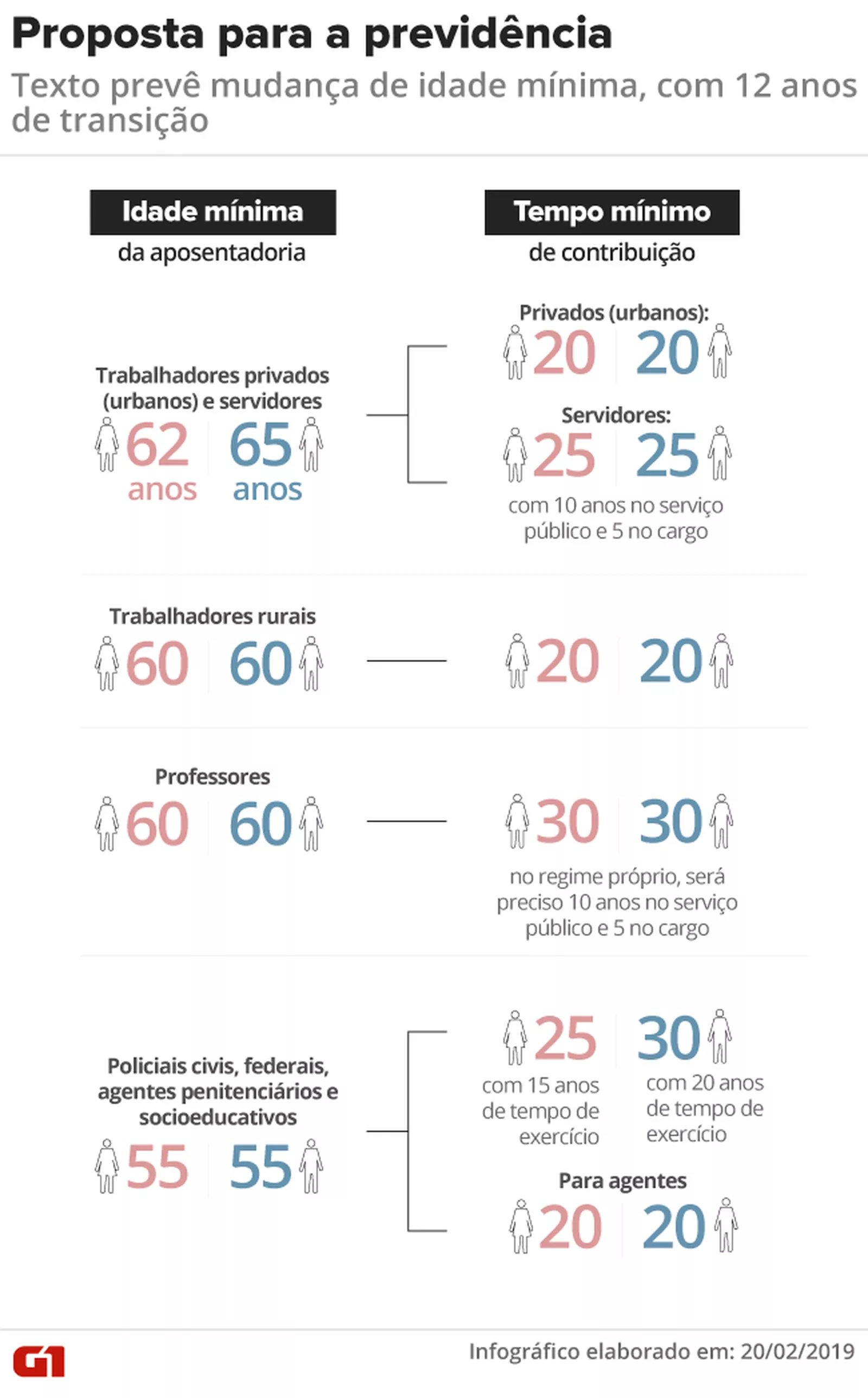 De acordo com o que o governo já havia anunciado na semana passada, a proposta prevê uma idade mínima de aposentadoria de 65 anos para homens e de 62 para mulheres, a ser aplicada após 12 anos de transição. Além disso, os beneficiários terão de contribuir por, no mínimo, 20 anos.