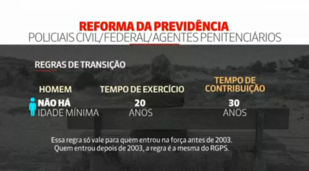 Para policiais, a idade mínima para aposentadoria ficará em 55 anos, com tempo mínimo de contribuição de 30 anos para homens e 25 para mulheres, e tempo de exercício de 20 anos para eles e 15 para elas.
