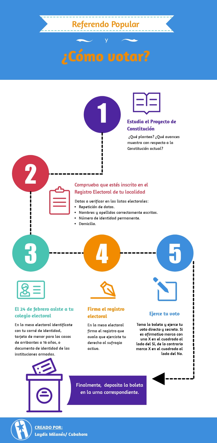 Participar en el referendo de la nueva Constitución, fruto del esfuerzo de todos los cubanos que colaboraron en su creación y en la consulta popular, es una forma de respetar el trabajo de todos los involucrados en el proceso, incluido el propio, de ser partes de la construcción de nuestro país, expresar nuestra opinión y de ejercer el derecho ciudadano que se nos otorga.