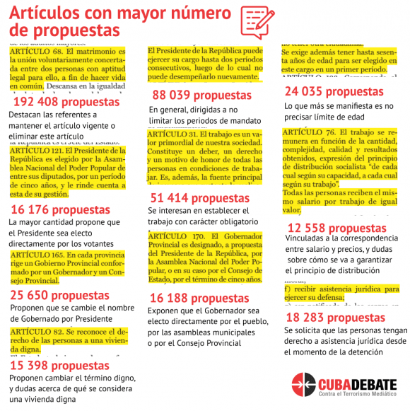 Asimismo, las opiniones de los cubanos residentes en el extranjero fueron agrupadas en 978 «propuestas tipo», siendo aceptadas 391 de ellas.