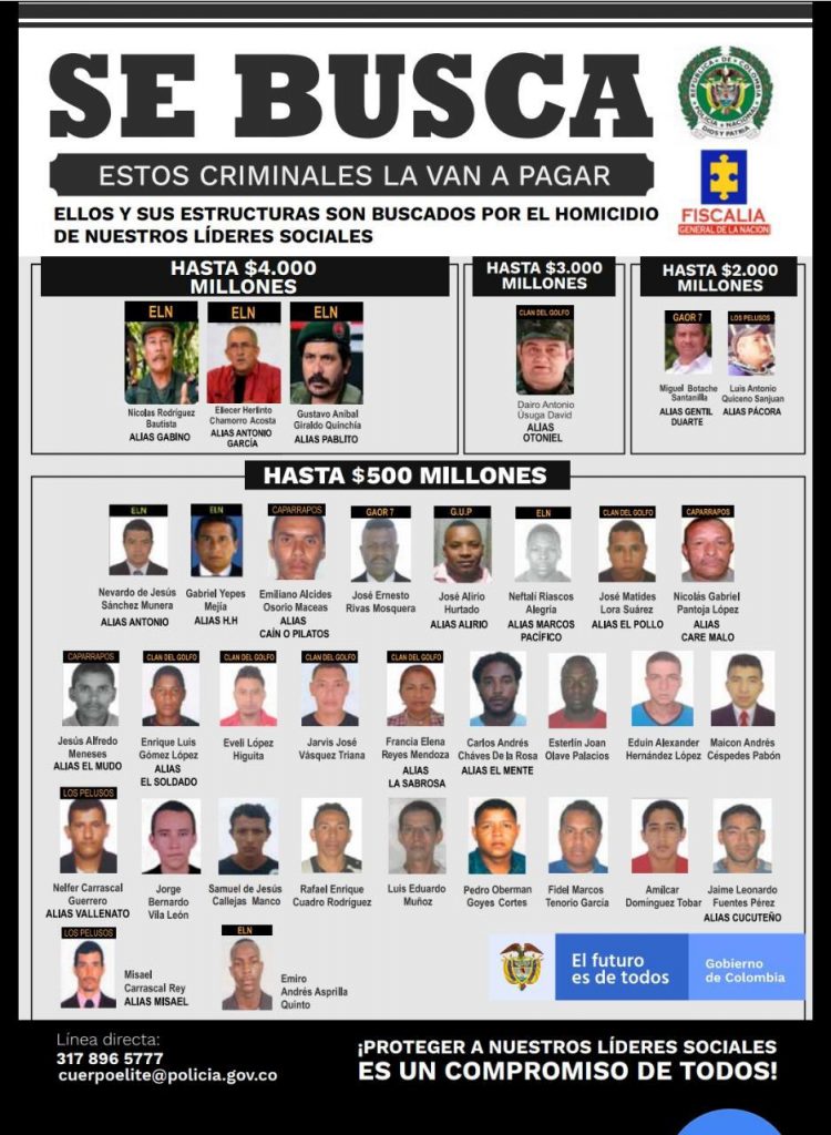“Se van a ofrecer $3.000 millones por un criminal como ‘Otoniel’, quizás la cabeza más visible del Clan del Golfo. Vamos a ofrecer $2.000 millones por alias ‘Gentil Duarte’ y alias ‘Pácora’, que corresponde al grupo terrorista de Los Pelusos”, anunció el mandatario.
