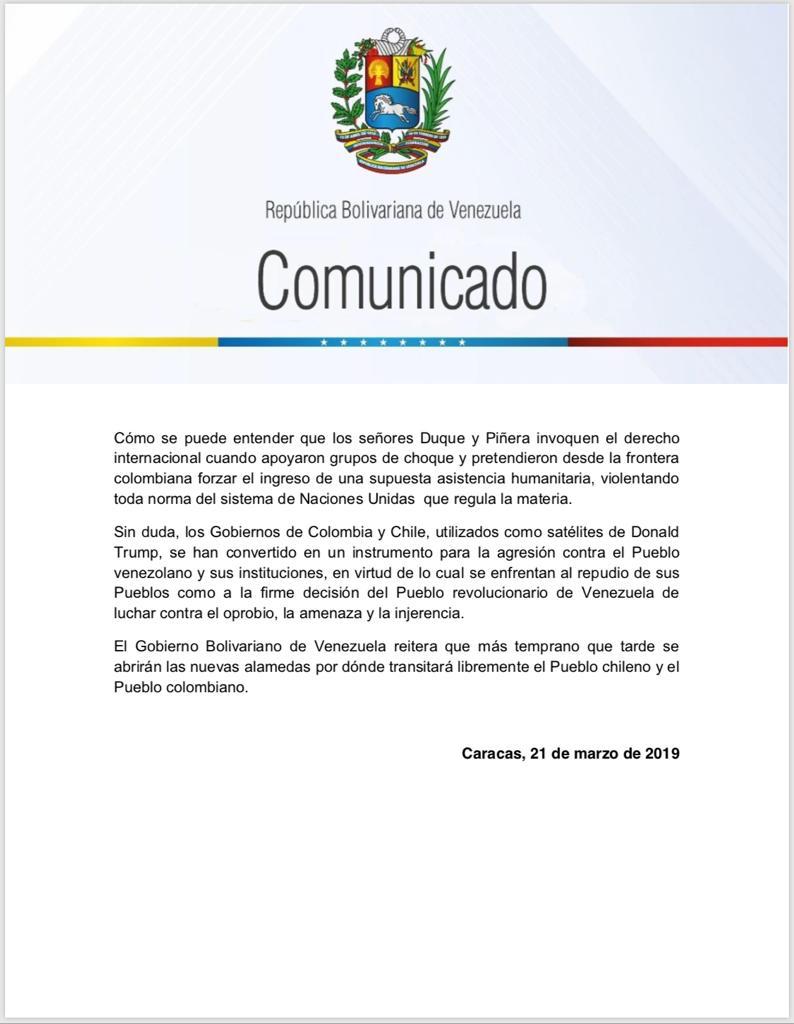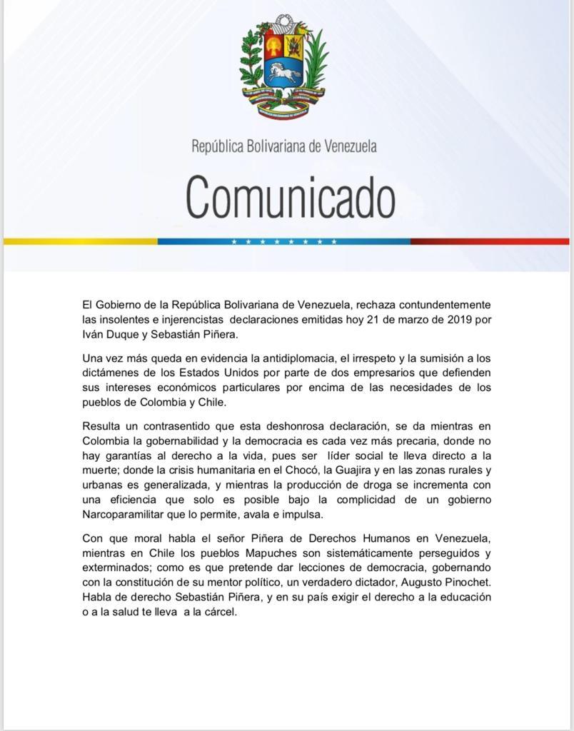 Comunicado del gobierno de Venezuela en rechazo a las declaraciones de Duque y Piñera