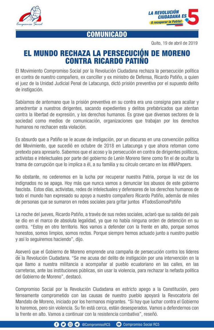 Por medio de un comunicado, el movimiento Revolución Ciudadana calificó de absurda la acusación de instigación en contra del excanciller, Ricardo Patiño, por parte de la justicia ecuatoriana. Además aseguró que la presión preventiva «no es más que la persecución del gobierno de Lenín Moreno en contra de los militantes del correísmo».