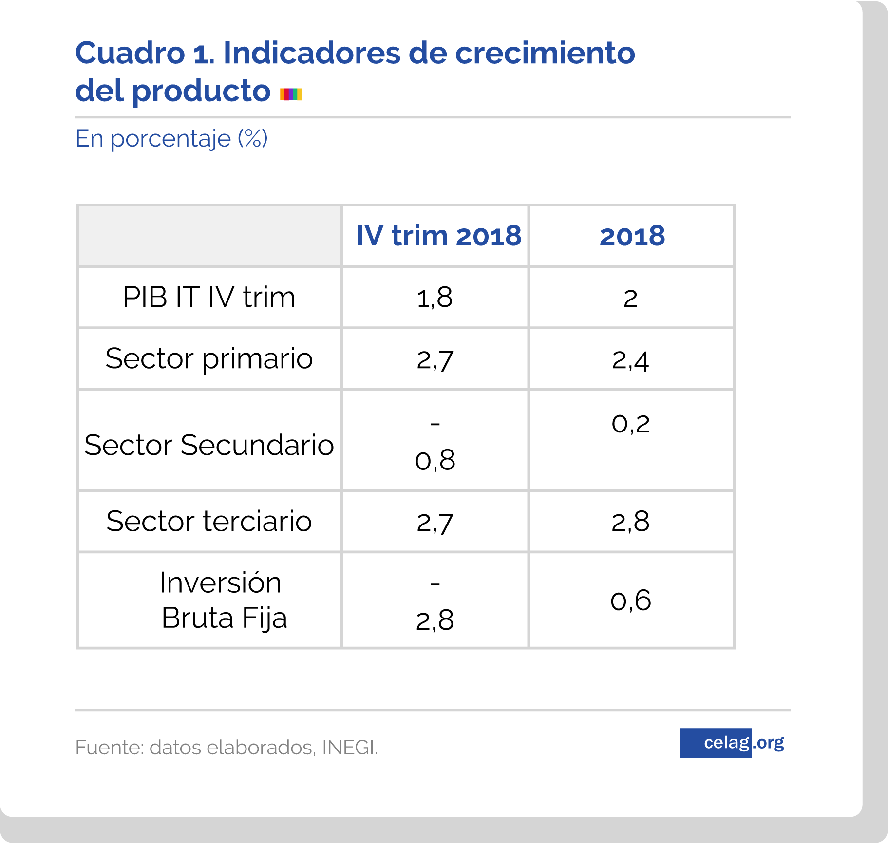 El PIB muestra un crecimiento interanual entre el cuarto trimestre de 2017 y el de 2018 de 1,8%. Acompañaron el crecimiento de la producción el sector primario y terciario con un aumento del 2,7%. En contraste, el sector secundario, durante el cuarto trimestre, cayó 0,8%.