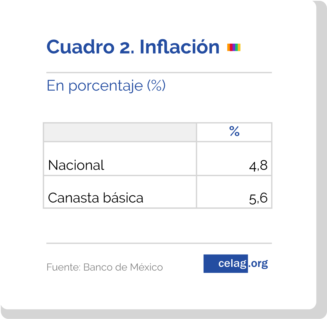 La inflación anual alcanzó un 4,8%, superando el objetivo establecido por el Banco de México de 3%. Asimismo, el nivel de inflación de la canasta básica llegó a 5,6%, mostrando un mayor impacto del aumento de precios en los productos de primera necesidad. En este sentido, tuvieron un fuerte peso los gasolinazos impulsados por Enrique Peña Nieto (EPN), al liberar el precio del combustible el año anterior.