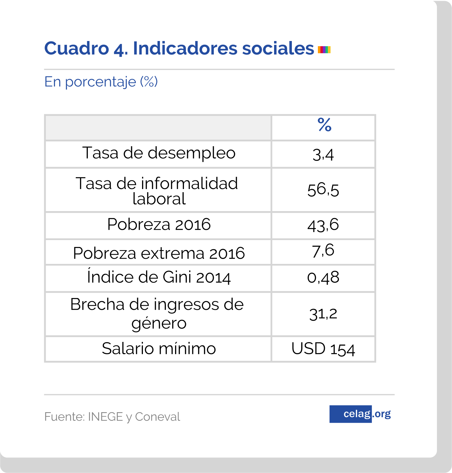 Con el estado económico presentado, no puede esperarse una mejoría de los indicadores sociales. El salario mínimo llevaba un fuerte retraso en términos reales. Las medidas económicas del Gobierno anterior no repararon sobre la situación social mexicana sino sobre mejorar las condiciones macroeconómicas de cara al mercado y la posibilidad de crecimiento del sector privado. Así, los indicadores sociales de México se mantienen entre los peores de la región.