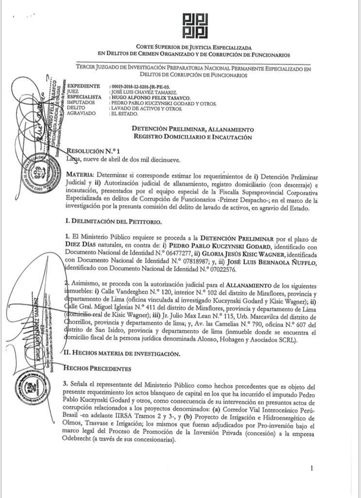 El Tercer Juzgado de Investigación Preparatoria Permanente Especializado en Delitos de Corrupción de Funcionarios a cargo de jorge Luis Chávez Támariz admitió el pedido del Ministerio Público contra PPK y otros dos investigados: su secretaria Gloria Jesús Kisic y su chofer José Luis Bernaola.