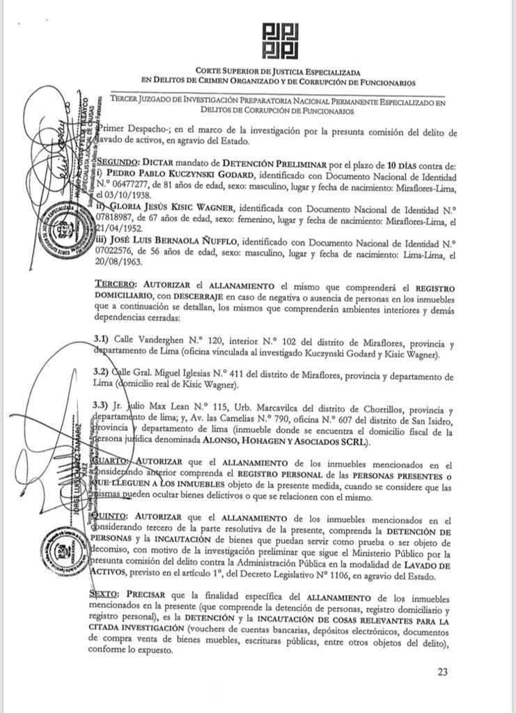 El Poder Judicial ordeno la detención preliminar del expresidente Pedro Pablo Kuczynski en el marco de la investigación por presunto delito de lavado de activos en el caso Odebrecht. Según el documento de la Corte Superior Especializada en delitos de Crimen Organizado y Corrupción de Funcionarios, el pedido de detención es por 10 días.