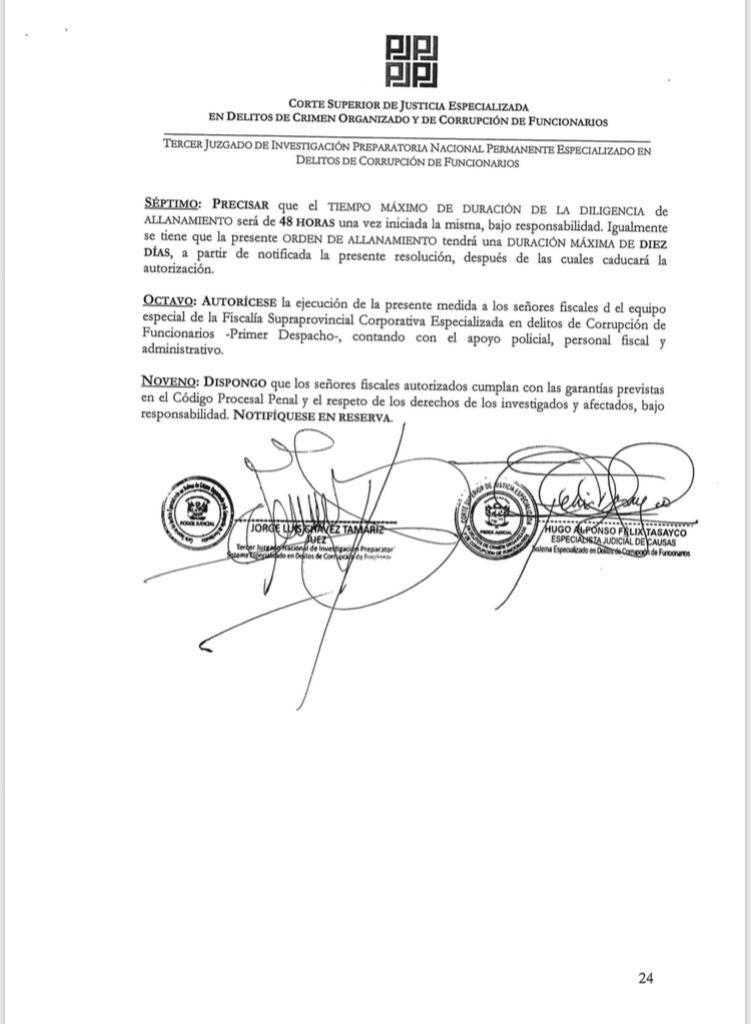 La orden fue autorizada por el juez José Luis Chávez Támariz, magistrado del Tercer Juzgado de Investigación Preparatoria. El detalle específico del presunto delito es lavado de activos en agravio del Estado, en el marco de la investigación por el caso Odebrecht.