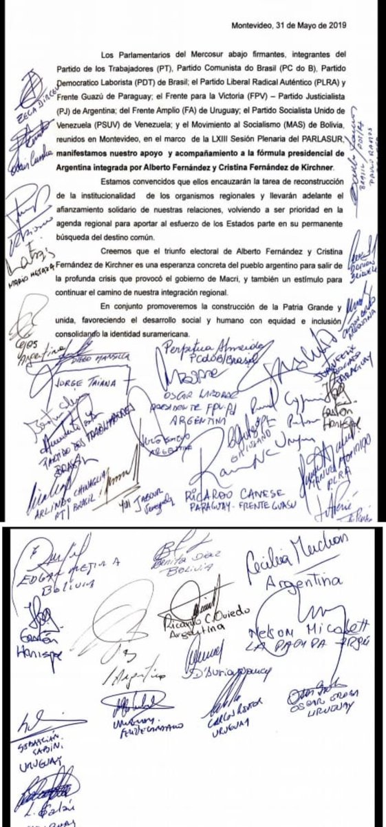 Temprano, mientras Fernández llegaba en barco a Montevideo, legisladores del PT de Brasil, Partido Liberal y Frente Guazú de Paraguay, PJ de Argentnia, Frente Amplio de Uruguay, PSUV de Venezuela, MAS de Bolivia, junto a diputados peronistas, firmaron una declaración en la que sostienen que un «triunfo electoral de Alberto Fernández y Cristina Fernández de Kirchner es una esperanza concreta del pueblo argentino para salir de la profunda crisis que provocó el gobierno de Macri», por lo que manifiestan «apoyo y acompañamiento» a esa fórmula. Agregan que si el kirchnerismo gana las elecciones argentinas podrá hacerse la «reconstrucción de la institucionalidad» de la región y podrá promoverse la «patria grande» latinoamericana.
