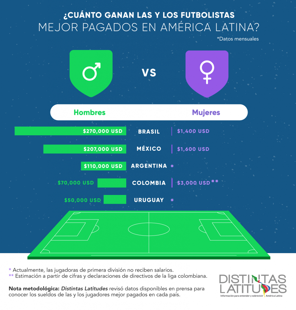 Según Juan Pablo Moreno, integrante la Comisión Femenina de la División Mayor del Fútbol Colombiano (DIMAYOR), “Los sueldos son muy distantes, podría decirse que puede haber un margen de 1 a 20 comparado con lo que gana un hombre en condiciones top”.