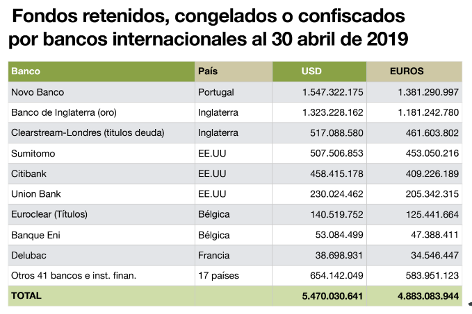 Además, a la fecha la nación tiene 4 mil 883 millones de euros congelados, retenidos o confiscados por bancos internacionales, dinero que está destinados para comprar alimentos, medicinas y materia prima para equipos para la industria.